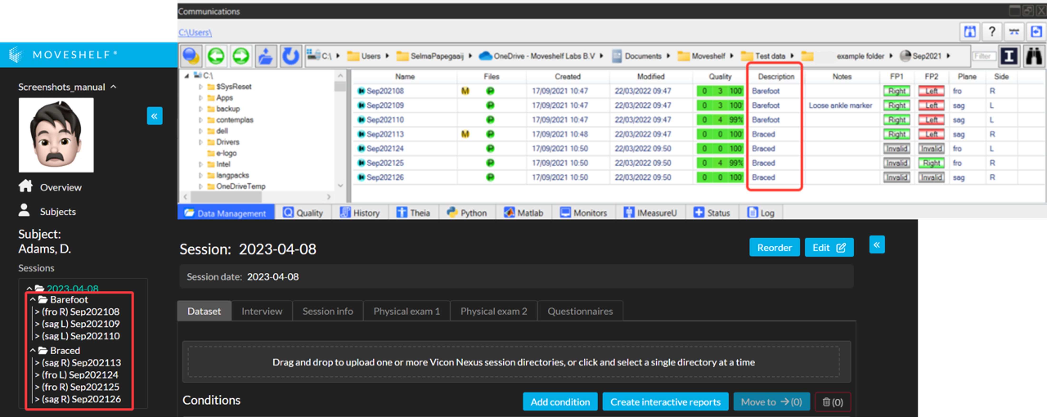 - If your session has multiple conditions, you can add condition information separately for each condition. For example, in the screenshot below the session contains two conditions: Barefoot and Brace. Condition information can therefore be entered for both.