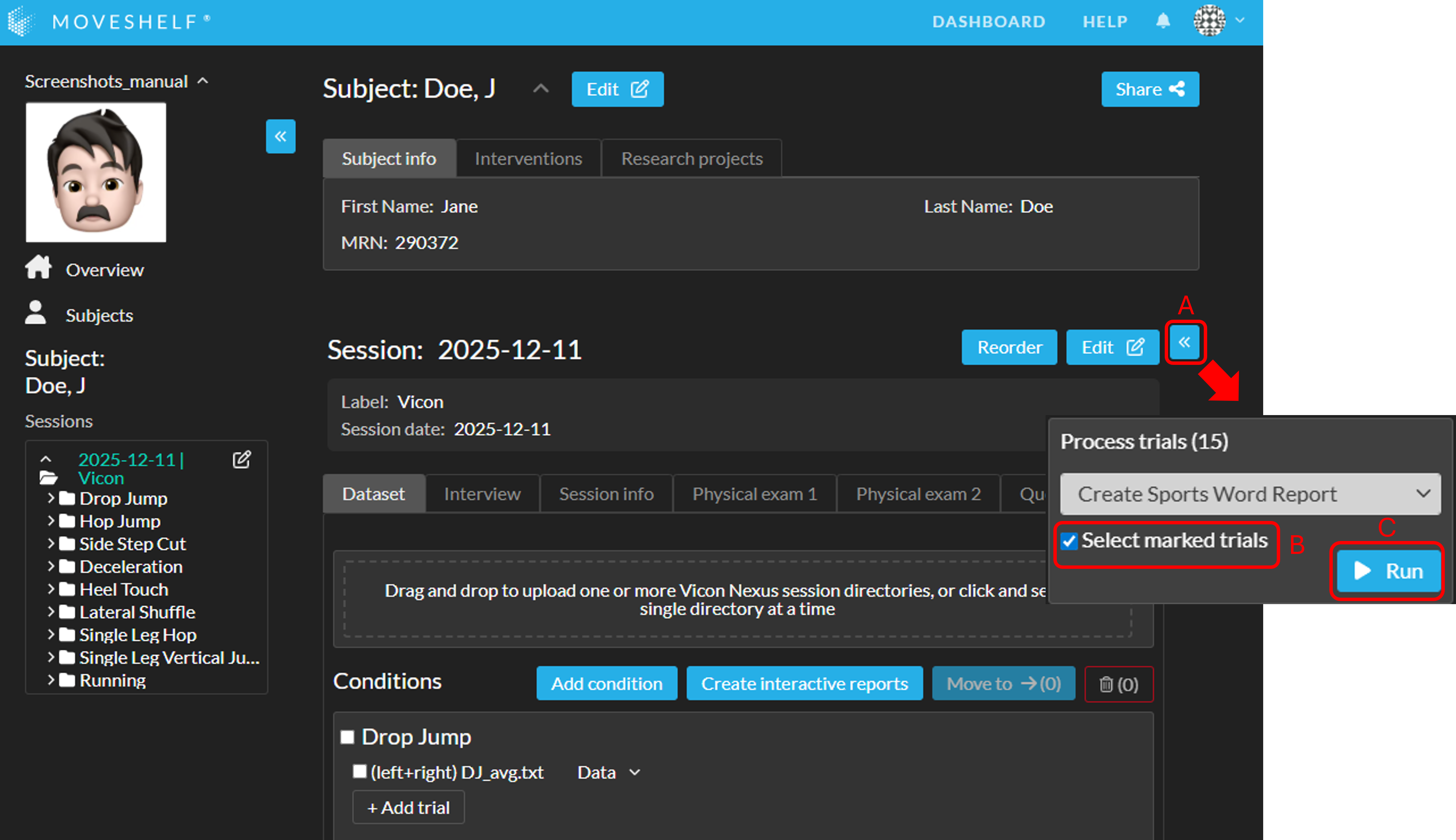 - Click 'Run' (C in the image below). The button will change to 'Requesting' with a spinning wheel. Please do not close the Moveshelf page or navigate away from the page until the Word report appears (and 'Requesting' changes back to 'Run'). Once the report is visible, you may leave the page, even if the report is still processing.