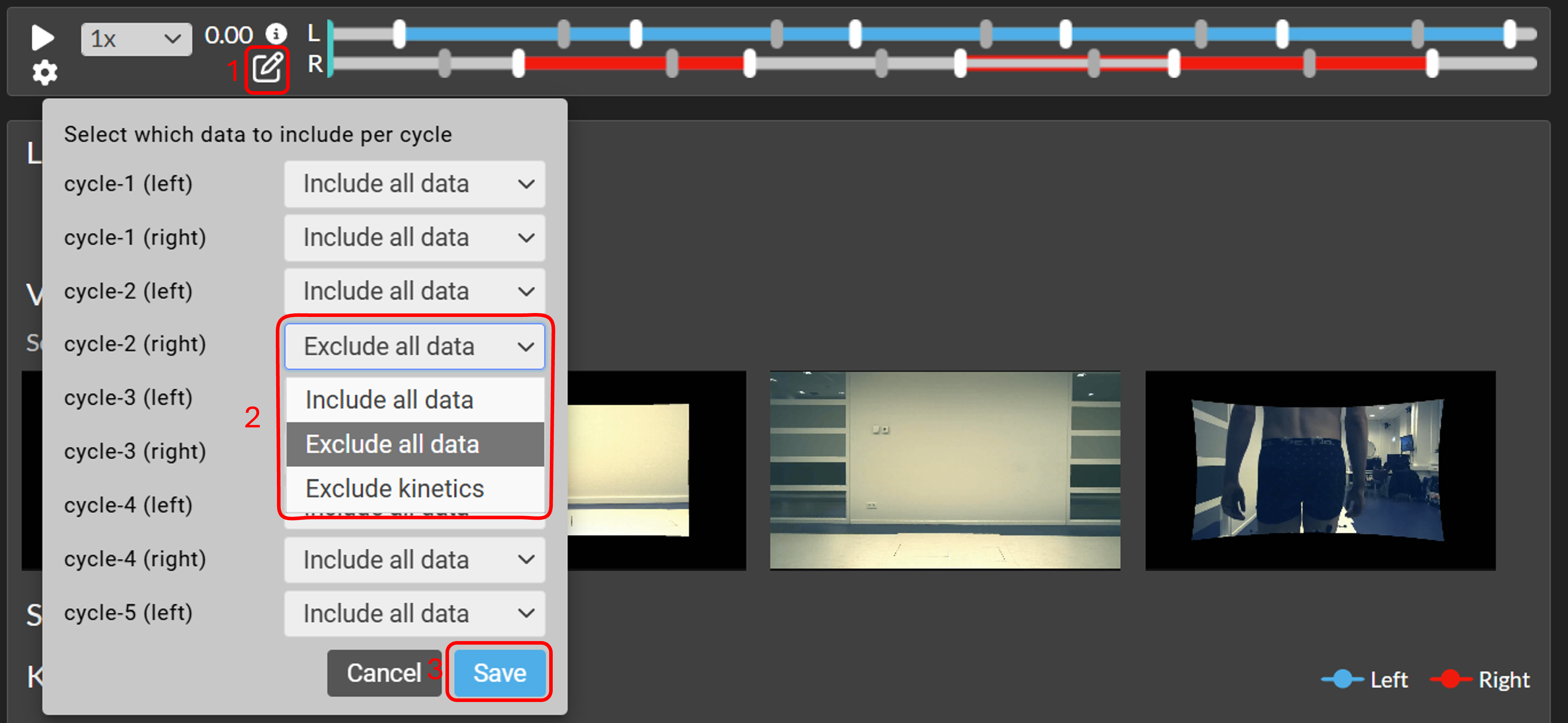 - In the pop-up window you can select per gait cycle to Include all data, Exclude all data, or to Exclude kinetics (see 2 in the image).