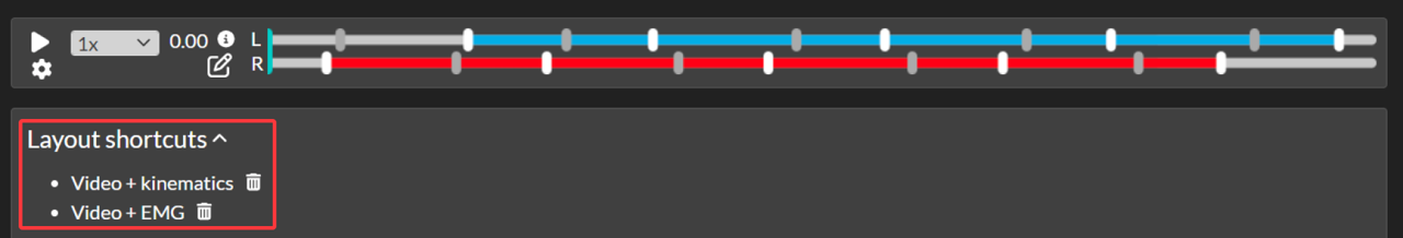 If you wish to view the same split screen layout for each subject, contact Moveshelf support to set up default layout shortcuts in the project configuration. These layout shortcuts will then automatically appear in each trial and report for all subjects, under the header 'Layout shortcuts' (see image above). Note that default layout shortcuts cannot be deleted.Saved layout shortcuts