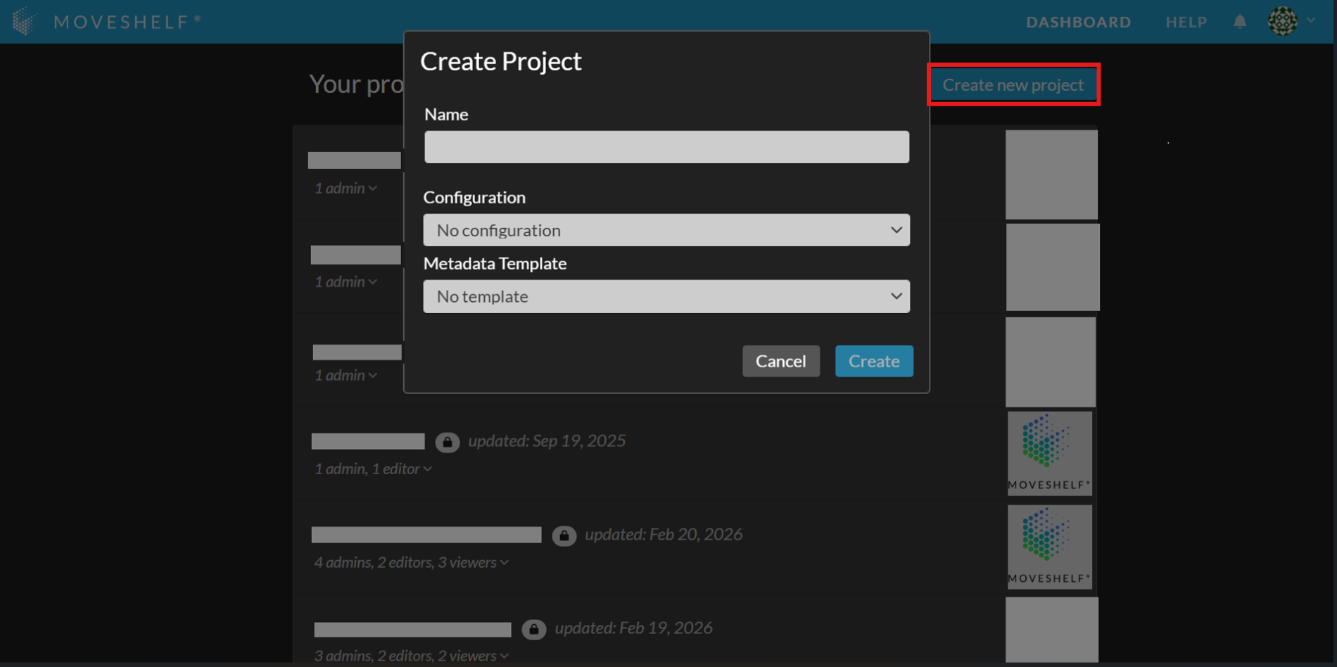 - Click on ‘Create new project’ to add a new project to your Moveshelf dashboard.