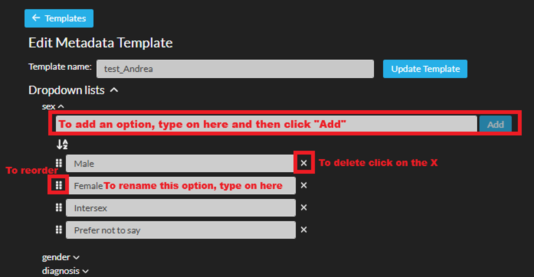 Organization Owners can update dropdown list entries in a metadata template: